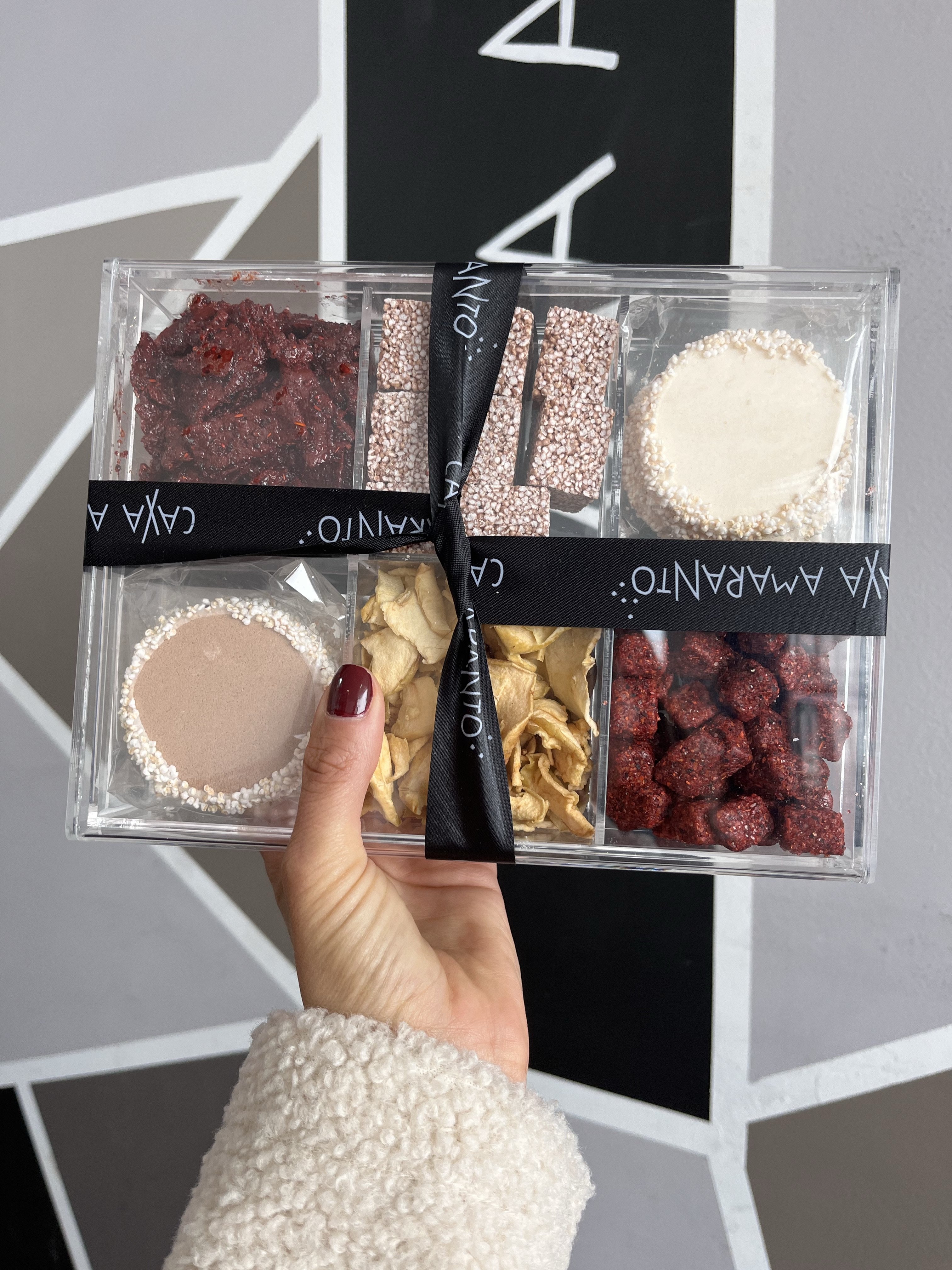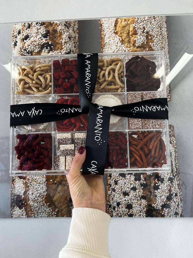 Caja de navidad con 6 productos barritas con chocolate 2 obleas con chocolate tamarindos cubirindo manzana deshidratada