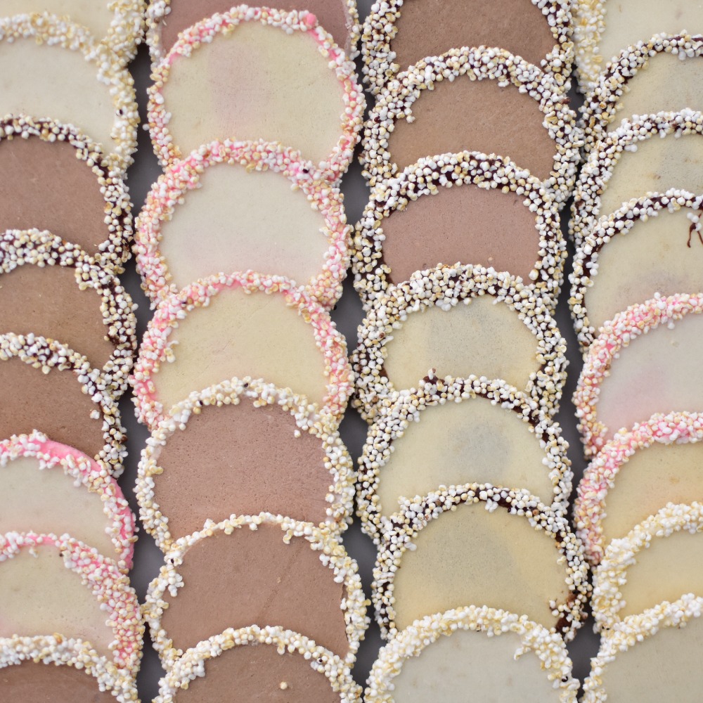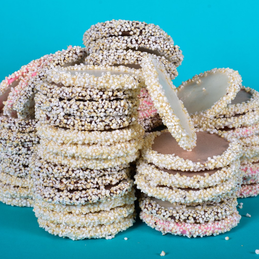 Mini oblea de amaranto elaborada con harina de amaranto, harina de linaza, amaranto reventado, chocolate semi - amargo y chocolate blanco. Sin gluten. Producto 100% mexicano.