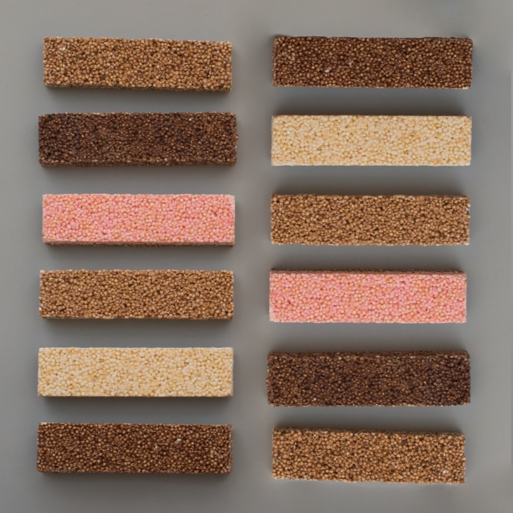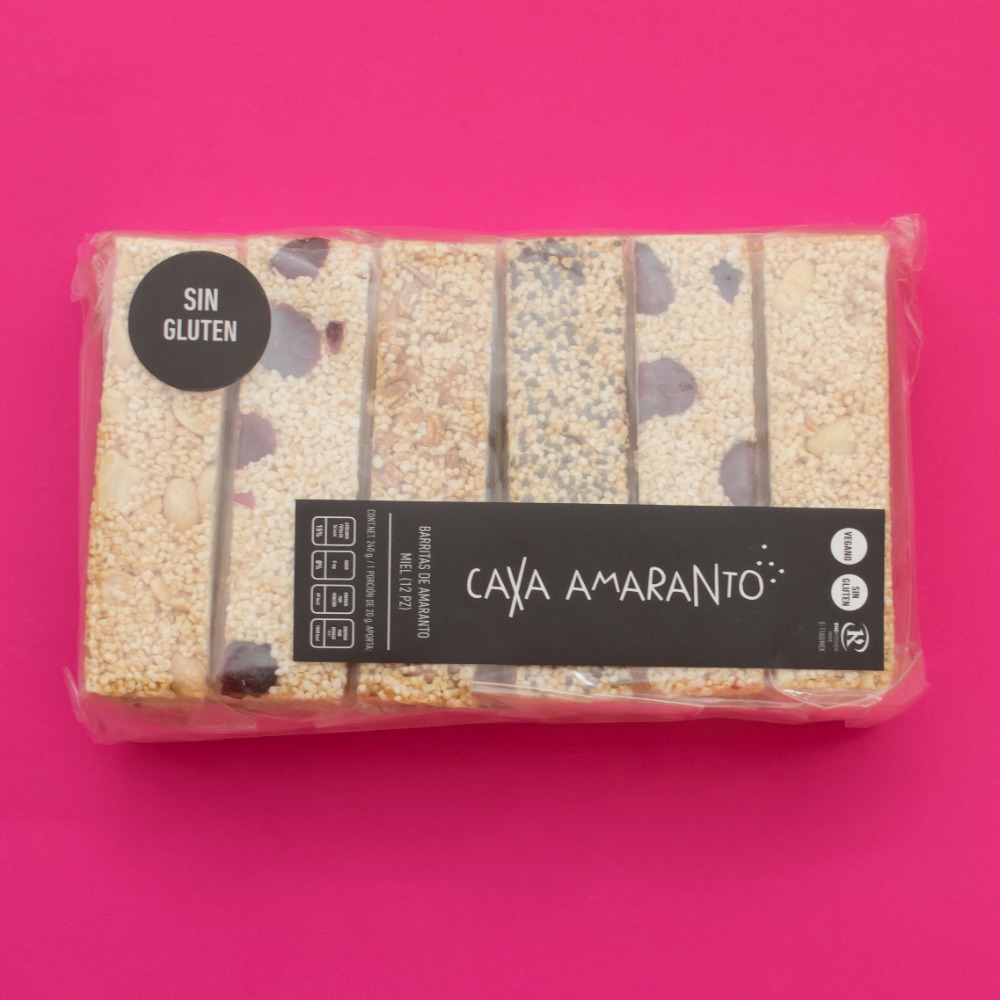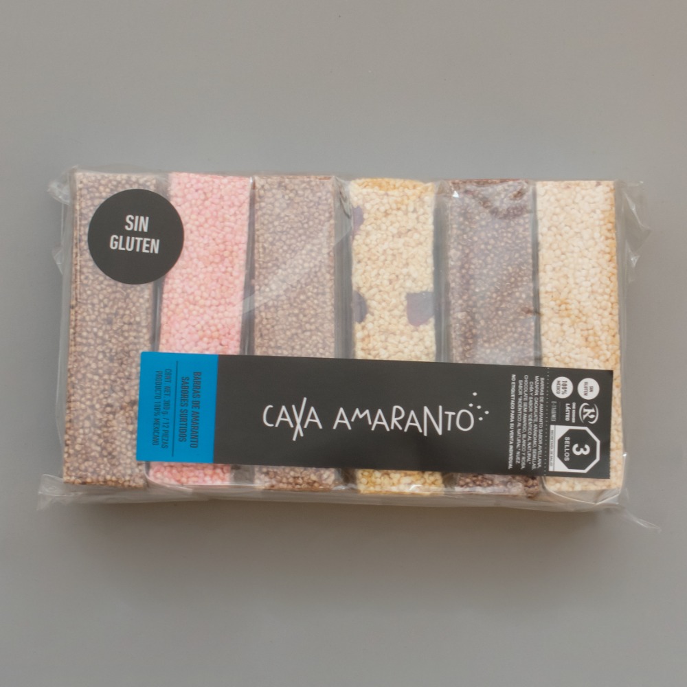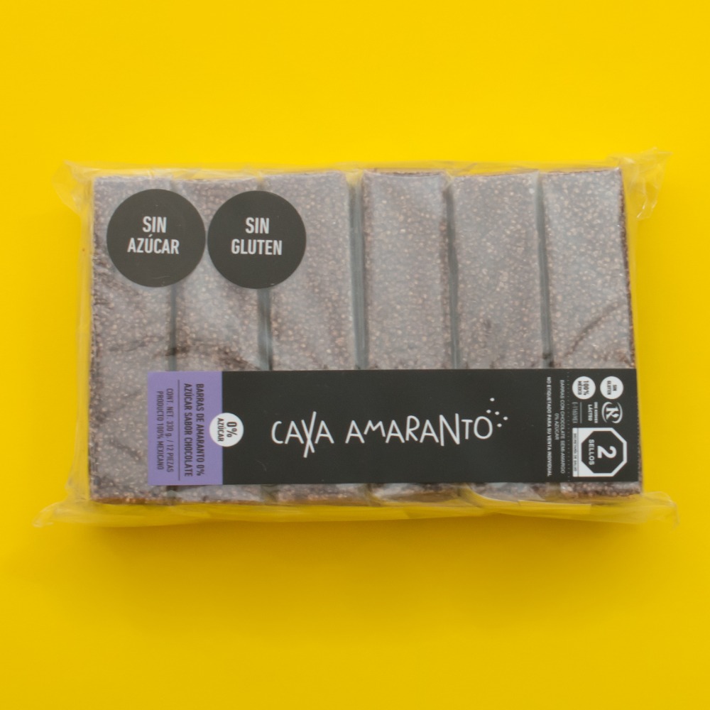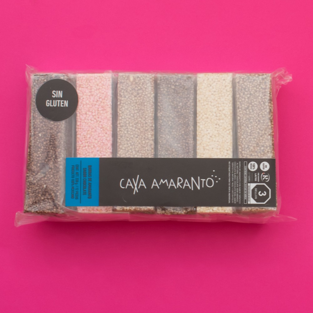 Barritas elaboradas con amaranto orgánico, chocolate semi-amargo, chocolate claro, chocolate blanco, chocolate de fresa, avellana, cacahuate, café, chía, avena, linaza, semilla de girasol y arándano. Sin gluten. Cont 12 piezas 312g. Producto 100% mexicano.